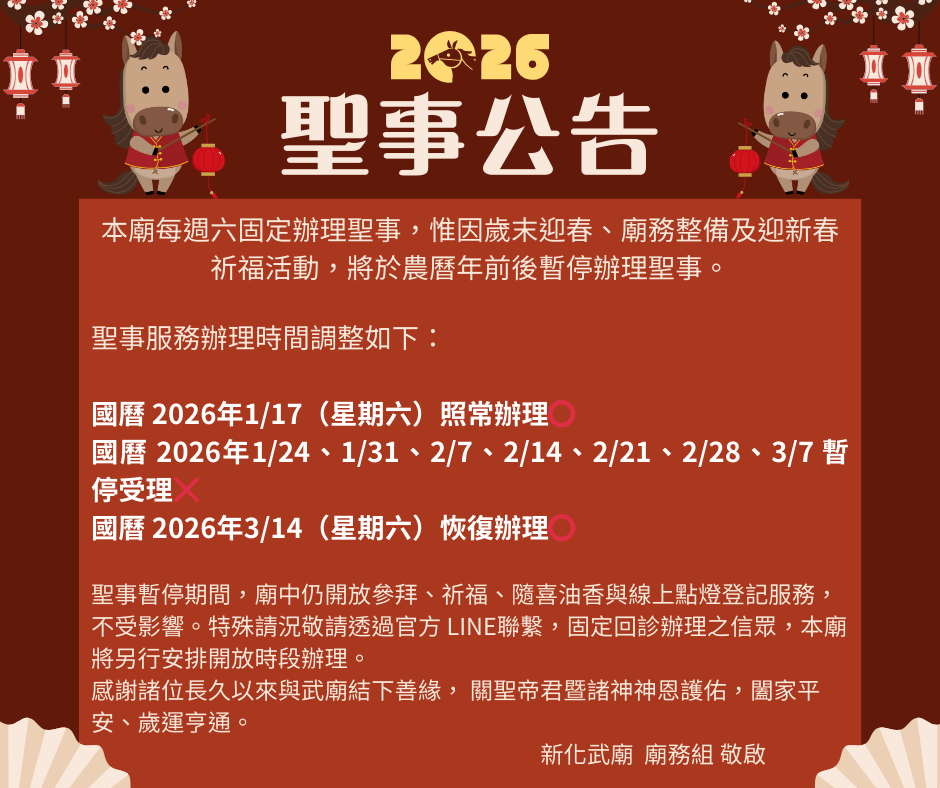 本廟謹訂於農曆七月二十八日(國曆9/19),舉辦「地藏王菩薩聖誕法會」,超薦九玄七祖、冤親債主、嬰靈及無主孤魂。中午舉行普渡祭儀,信眾可登記普渡桌,普渡物資將統一轉贈社福機構,廣結善緣。祈求陰陽兩利,闔境平安。